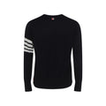 Fleece wool Cardigan by Thom Browne, striped cuffs with button, ribbed hem with adjustable side slits with buttons, V-neck, front button closure, two patch pockets on front, iconic brand logo bands on left arm, internal profiles with iconic brand colors.
