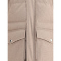 Brunello Cucinelli’s cashmere Down Jacket is a refined expression of functional elegance. Made of fine cashmere, with a midi silhouette and thoughtful details, it combines warmth and style. The zipper and snap-button closure complements practical front flap pockets and zippered welt pockets. The adjustable and removable hood adds versatility, making it perfect for tackling winter with understated sophistication.