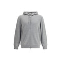 Brunello Cucinelli cashmere Hoodie features an adjustable hood with drawstring for a customizable fit. The front closure features a double-slider zipper for added convenience and adjustability. Two patch welt pockets on the front add convenience, while ribbed cuffs and hem ensure a snug, comfortable fit. The monochrome design lends a touch of minimalist elegance, while the regular fit offers comfort without sacrificing style. A versatile garment, perfect for everyday wear or moments of relaxation.