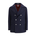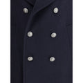 Brunello Cucinelli’s double wool flannel caban combines elegance and functionality in a refined design. Featuring a metal button closure and classic lapel collar, it has low vertical pockets and a semi-lined interior. The structure is completed with two interior button pockets, a practical pen holder and a double back slit, providing comfort and freedom of movement.