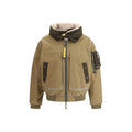 The Gold B. bomber Jacket by Parajumpers features a double-slider front zipper closure and adjustable hood with drawstring. It has six exterior pockets, including two cargo pockets, and an interior mesh pocket. Cuffs, inner collar and bottom are finished in rib knit for a comfortable fit. The Parajumpers patch on the sleeve and the iconic yellow tape at the collar closure complete the design.