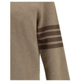 Thom Browne’s cotton Milano Sweater represents the perfect balance of classic elegance and iconic details. Made from pure cotton, it features a ribbed crew neck, ribbed cuffs and hem with side slits that can be adjusted via buttons for a customized fit. On the left sleeve stand out the unmistakable contrasting horizontal bands, the distinctive symbol of the maison. A refined garment, ideal for completing formal and casual looks with an unmistakable touch.