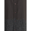 The pinstripe Wool and Lace Shirt by Fendi blends sartorial rigor with delicate femininity. Designed with long sleeves and a button-down collar, it features exposed mother-of-pearl buttons that highlight its refined craftsmanship. A black lace insert at the hem adds an elegant double-layer effect, creating a striking contrast with the structured pinstripe wool. Timeless yet contemporary, this piece embodies effortless sophistication with a distinctly urban edge.
