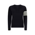 Fleece Wool Sweater by Thom Browne, ribbed crew neck, ribbed hem, ribbed cuffs, iconic brand contrast stripes on left arm, monochrome pattern, regular fit.