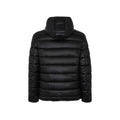Suns reversible polyester padded jacket with rainproof zip closure and covered snap buttons, fixed hood, two side pockets, and inside pockets.